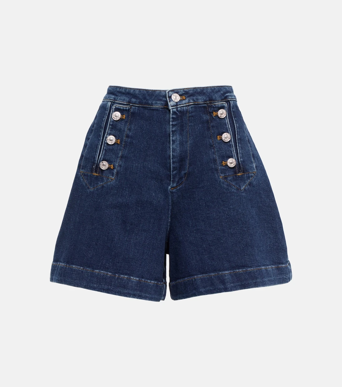 Sorgen Sie mit den maritim angehauchten Marina Shorts von 7 For All Mankind für lässige Looks. Das dunkelblaue Design verfügt über eine hohe Taille, Zierknöpfe und braune Steppnähte.